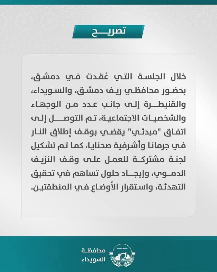 انعقد مساء الأربعاء اجتماع ضم مسؤولين من الحكومة المؤقتة، من بينهم محافظو السويداء والقنيطرة وريف دمشق، مع شيخي العقل، أبو وائل حمود الحناوي، ويوسف جربوع، وقائد حركة رجال الكرامة الشيخ، يحيى الحجار، والشيخ، ليث البلعوس.