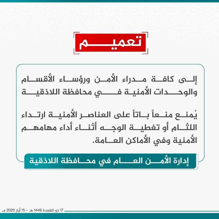 أصدرت إدارة الأمن العام في محافظة اللاذقية تعميماً يقضي بمنع العناصر الأمنية ارتداء اللثام.