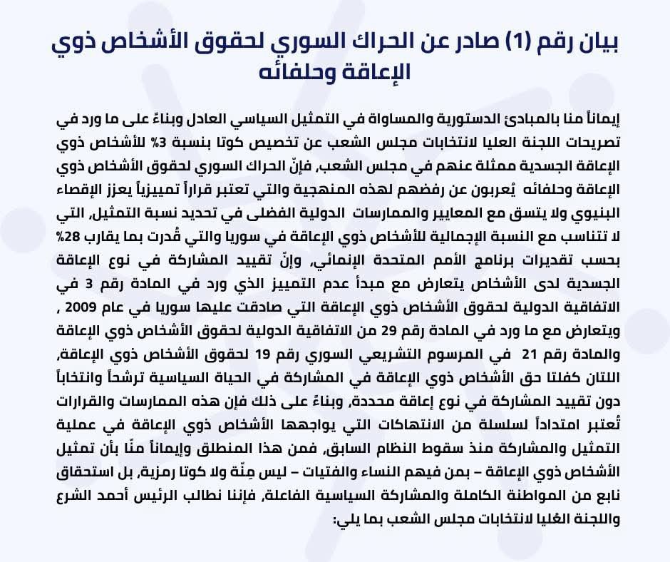 البيان أشار إلى أن نسبة الـ3% لا تعكس الواقع الديموغرافي للأشخاص ذوي الإعاقة في سوريا، والذين يشكلون نحو 28% من إجمالي السكان وفق تقديرات برنامج الأمم المتحدة الإنمائي. كما اعتبر الحراك أن قصر التمثيل على أصحاب الإعاقة الجسدية يتعارض مع مبادئ عدم التمييز المنصوص عليها في الاتفاقية الدولية لحقوق الأشخاص ذوي الإعاقة، المصادق عليها من قبل سوريا عام 2009، وكذلك يتعارض مع ما ورد في المادة رقم 29 من الاتفاقية الدولية لحقوق الأشخاص ذوي الإعاقة والمادة رقم 21 في المرسوم التشريعي السوري رقم 19 لحقوق الأشخاص ذوي الإعاقة، اللتان كفلتا حق الأشخاص ذوي الإعاقة في المشاركة في الحياة السياسية ترشحاً وانتخاباً دون تقييد المشاركة في نوع إعاقة محددة، وبناءً على ذلك فإن هذه الممارسات والقرارات تُعتبر امتداداً لسلسلة من الانتهاكات التي يواجهها الأشخاص ذوي الإعاقة في عملية التمثيل والمشاركة منذ سقوط النظام السابق.