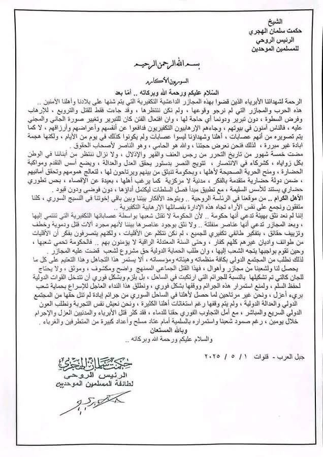 الهجري طالب المجتمع الدولي بعدم تجاهل الجرائم التي يتم ارتكابها بحق المدنيين، والتحرّك بشكل سريع لحمايتهم، معتبراً أن طلب الحماية الدولية حق مشروع في مواجهة المجازر.