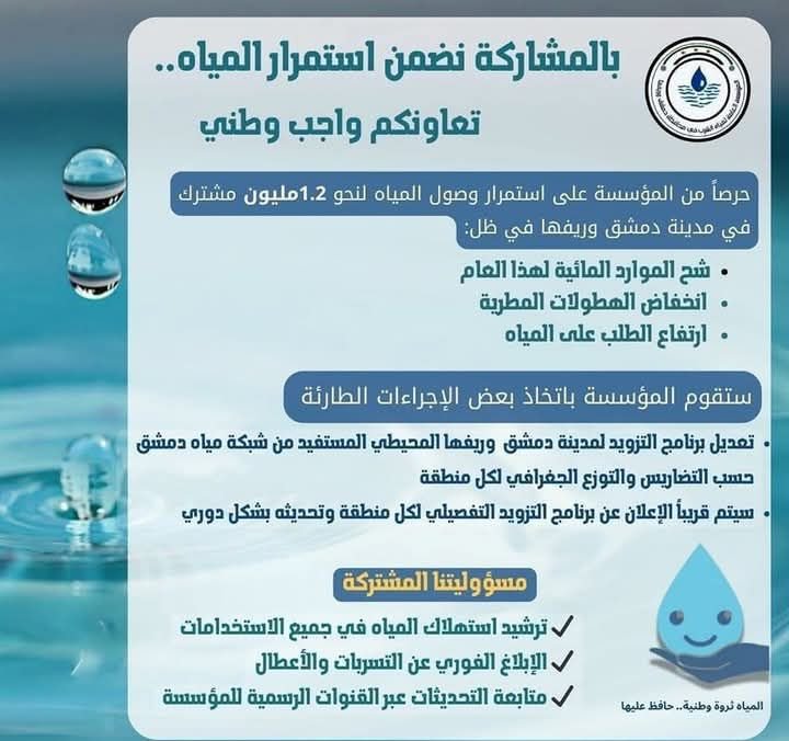 كما أكدت المؤسسة في إعلانها على أهمية ترشيد استهلاك المياه، وضرورة الإبلاغ عن الأعطال في حال حدوثها.