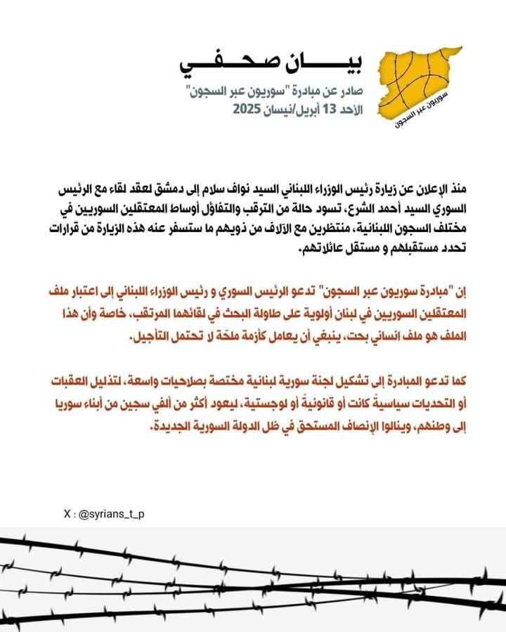 من جانب آخر، أصدرت مبادرة “سوريون عبر السجون” بياناً صحفياً دعت فيه الرئيس السوري أحمد الشرع ورئيس الحكومة اللبناني نواف سلام إلى جعل ملف المعتقلين أولوية على طاولة المفاوضات. كما شددت المبادرة على ضرورة التعامل مع هذا الملف كأزمة إنسانية ملحة لا تحتمل التأجيل، داعية إلى تشكيل لجنة سورية لبنانية ذات صلاحيات واسعة لتذليل العقبات السياسية واللوجستية والقانونية، بهدف إعادة المعتقلين إلى وطنهم.