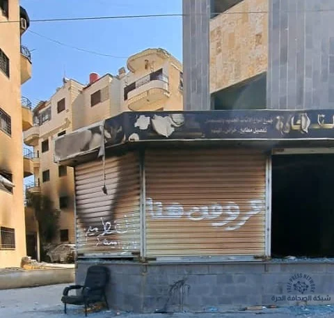 كان الطريق من دوار العمران حتى قرية نجران يشهد انتشاراً كثيفاً لقوات الأمن العام، مع دخول قوات جديدة من مدخل السويداء، كانت الأبنية محروقة وببعضها مدمر والمحال فارغة، كان هناك بعض المنازل التي ما زالت على حالها، وكانوا يتخذونها مواقع لهم، يجلسون، يأكلون ويشربون بداخلها.
