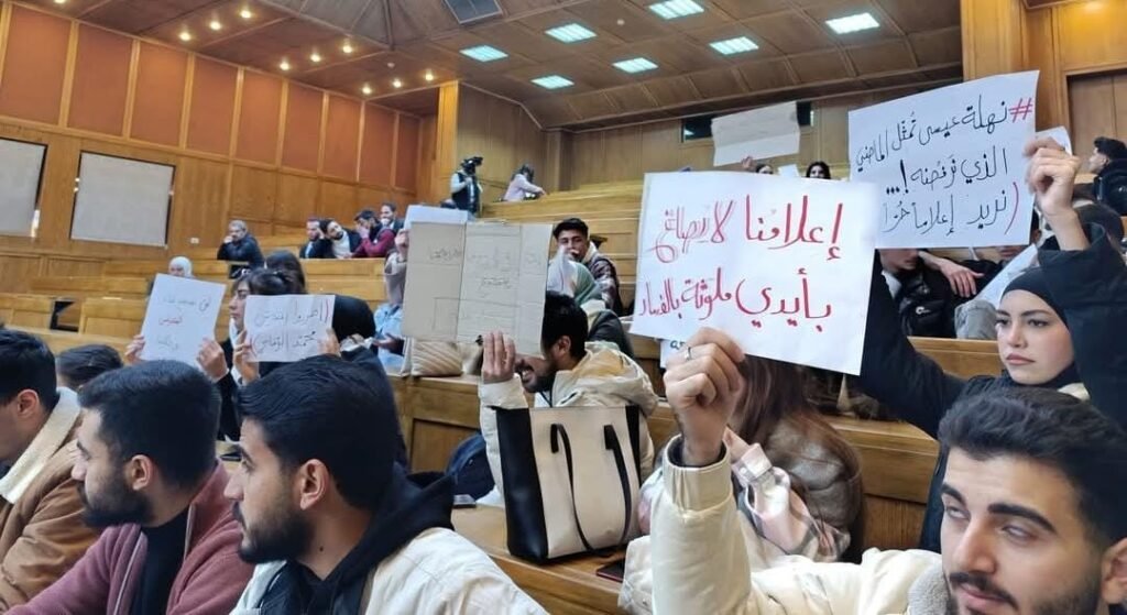 نظّم طلاب كلية الإعلام في جامعة دمشق اعتصاماً اليوم للمطالبة بإقالة عدد من أعضاء الهيئة التدريسية.