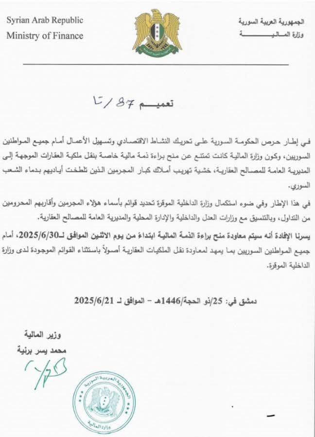 أصدرت وزارة المالية قراراً يقضي بإعادة منح براءات الذمة المالية لأغراض نقل الملكيات العقارية، بدءاً من 30 حزيران الحالي 2025.