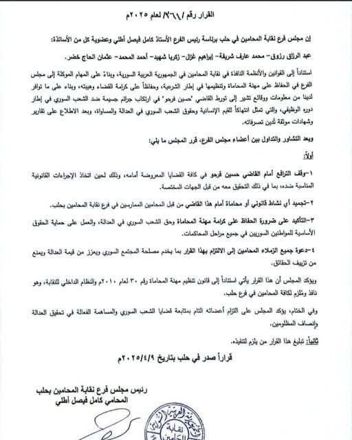 أصدر مجلس فرع نقابة المحامين في حلب، برئاسة المحامي كامل فيصل الطلي، قراراً بوقف التعامل مع أحد القضاة، بعد ثبوت تورطه في قضايا ابتزاز وكتابة تقارير كيدية بحق عدد من المواطنين السوريين، وذلك بالتنسيق مع جهات أمنية.