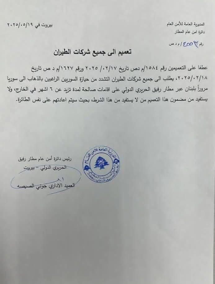 التعميم أشار أنه سيتم إعادة المخالفين على متن الطائرة ذاتها التي وصلوا بها، في إجراء وصف بالتشددي تجاه السوريين العابرين عبر الأراضي اللبنانية.